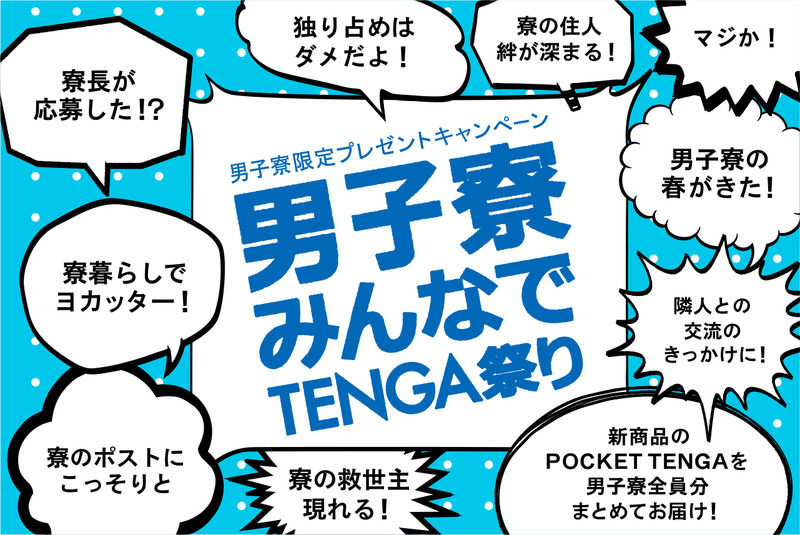 <キャンペーン概要>新商品の「POCKET TENGA」を仲間とみんなで使ってみませんか?あなたがお住まいの男子寮の各部屋に、ポストもしくはドアの隙間(9mm以上)があればどなたでも応募可能です。1人と言わず男子寮みんなの分をドーンとお贈りいたしますので、サプライズの演出に、普段の感謝の気持ちの表しに、是非このキャンペーンをご利用ください。